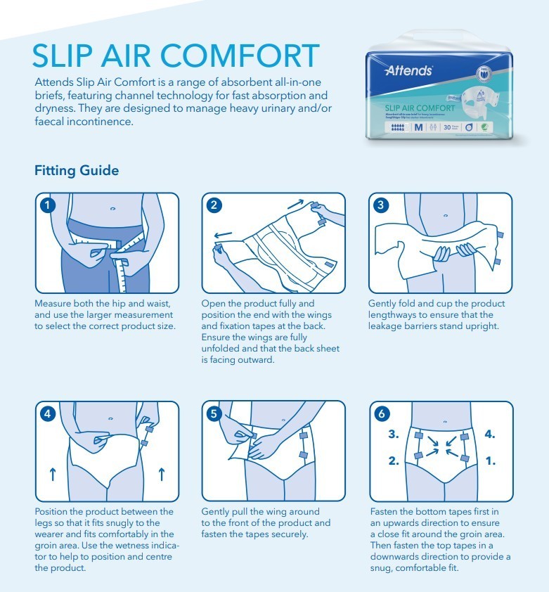 Attends Slip Air Comfort er en alt-i-ett-bleie for tung urin- og eller avføringsinkoninens. Justerbart fikseringssystem med fire taper sikrer at produktet holdes på plass.